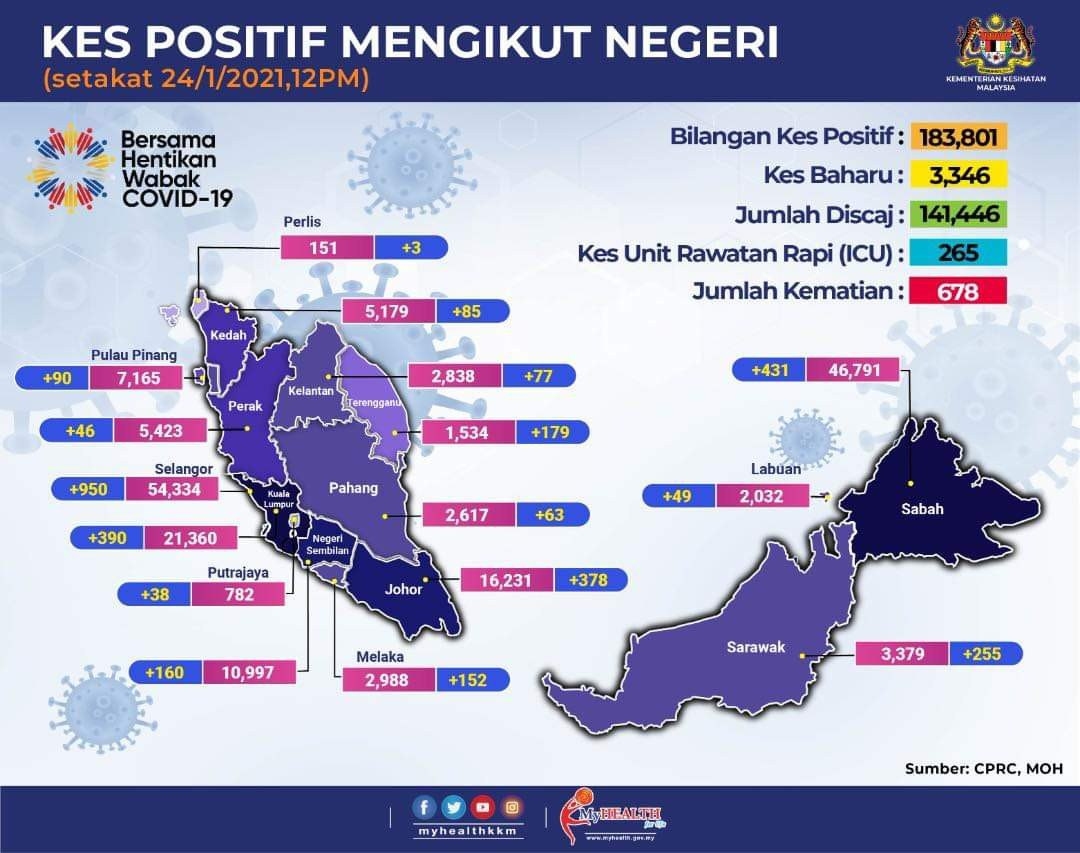 Out of the 3,346 new cases today, 7 are imported while 3,339 are transmitted locally. Selangor recorded the most with 950 cases, followed by Sabah with 431 cases, Kuala Lumpur with 390 cases, Johor with 378 cases and Sarawak with 255 cases.