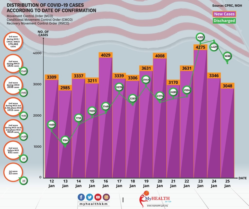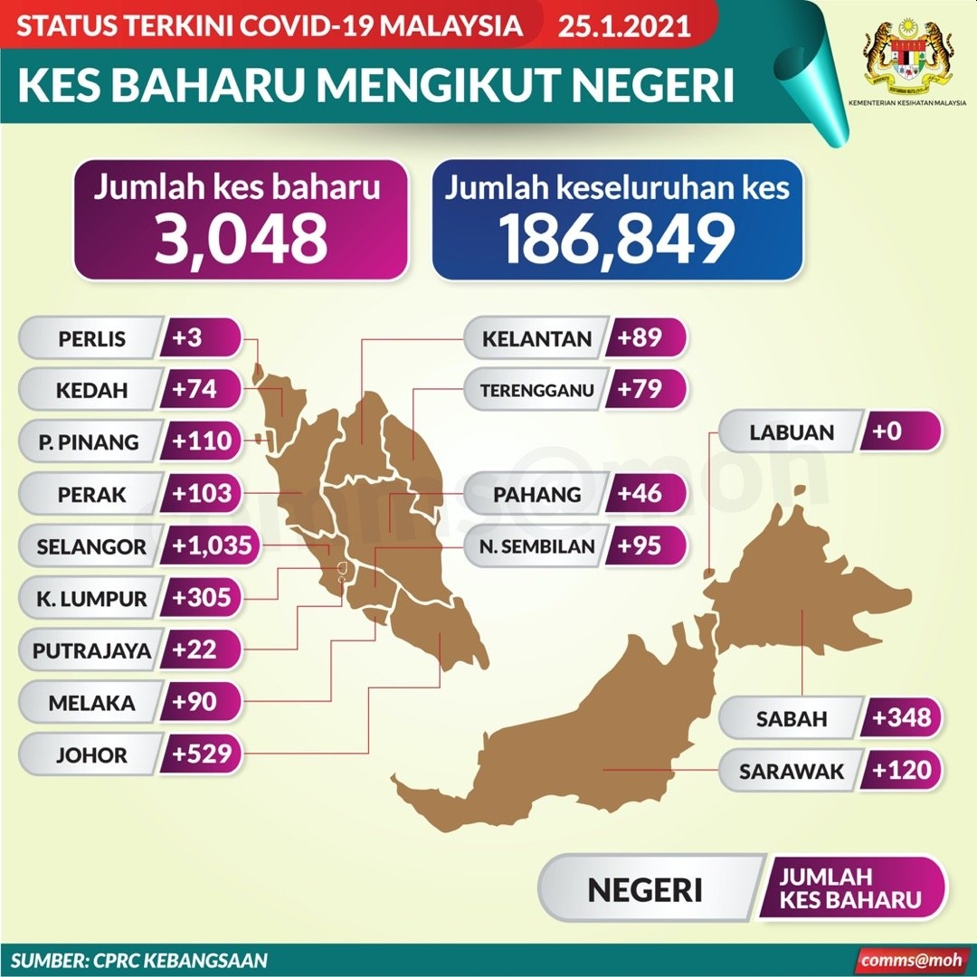 Out of the 3,048 new cases today, 8 are imported while 3,040 are transmitted locally. Selangor records the most with 1,035 new cases, followed by Johor with 529 cases, Sabah with 348 cases, Kuala Lumpur with 305 cases and Sarawak with 120 cases.