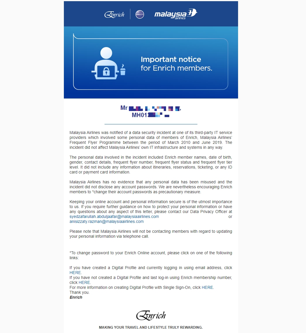 Malaysia Airlines has announced that it has a data security incident which reveals personal details of its Enrich members. The flag carrier had sent out an email notifying about the security breach to all of its frequent flyer members yesterday evening.