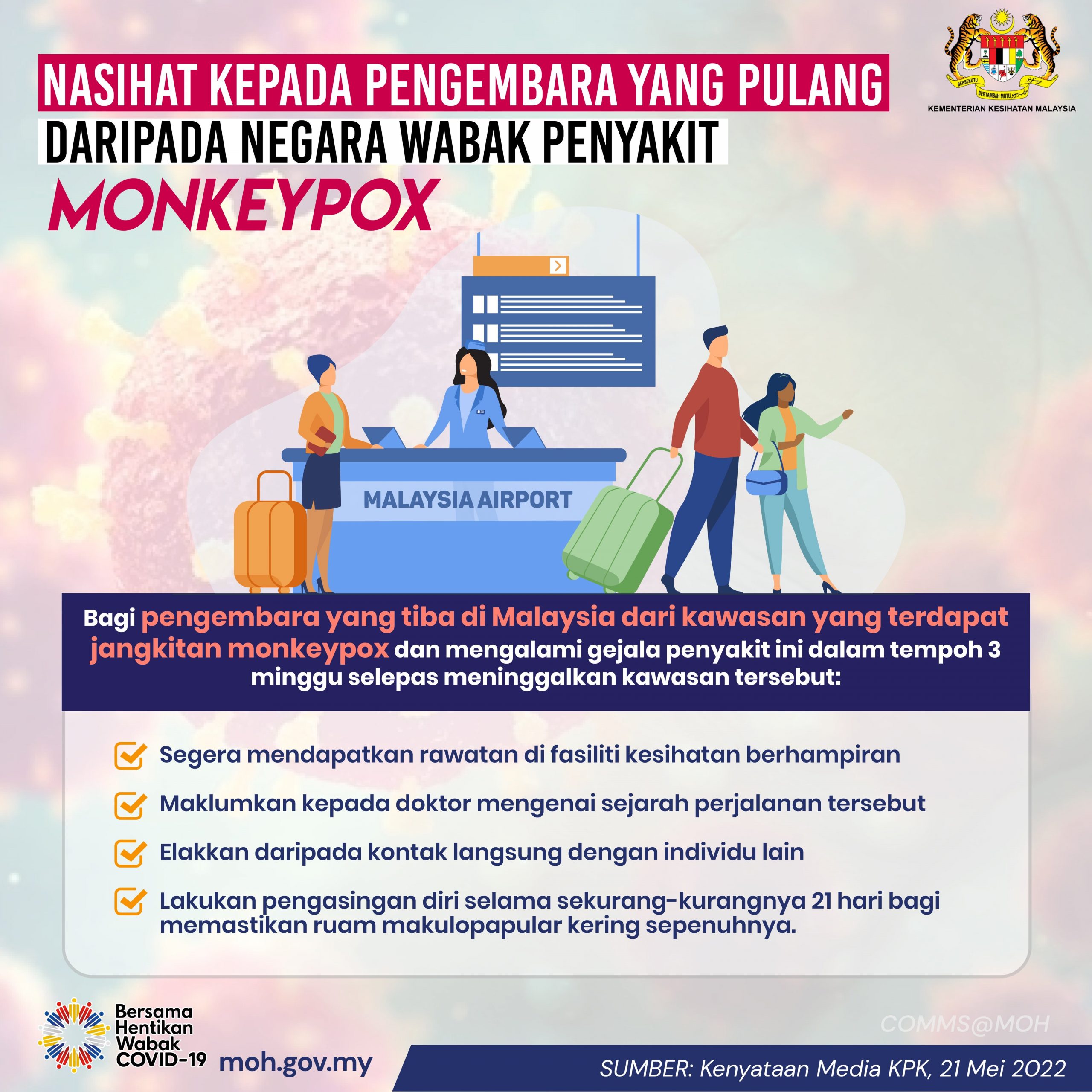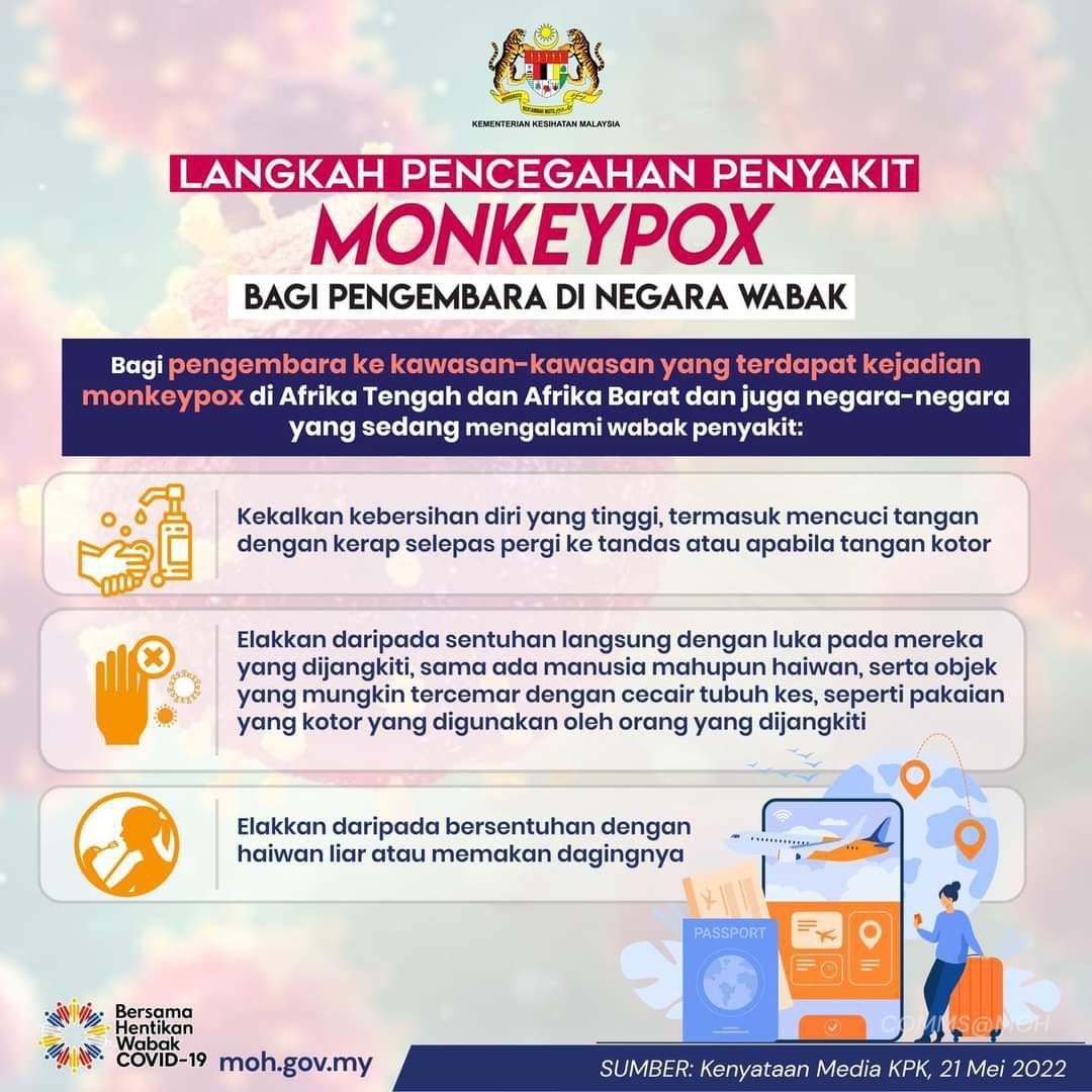 There has not been a reported case of monkeypox in Malaysia so far, but KKM has provided some information those who have recently traveled to countries with reported monkeypox cases. They advise that those with symptoms (including fever, intense headache, muscle aches, back pain, low energy, swollen lymph nodes, and a skin rash or lesions) will need to follow these instructions: